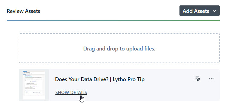 There are a few ways to upload review assets: you can drag and drop files from another source on your computer or select Add Assets to upload files with the following options: