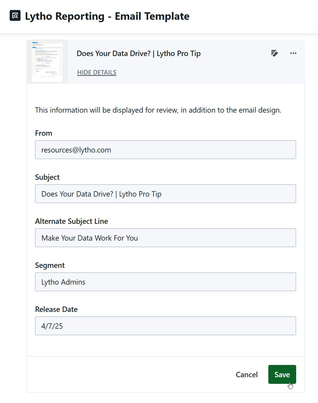 Before sending out for review, you have a few options to edit or add details including From, Subject, Alternate Subject Line, Segment, and Release Date. Select SHOW DETAILS under the name of the email asset to update these fields.