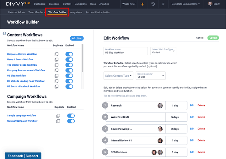 Enterprise and Pro accounts have the ability to create custom workflows, which can be used to establish process templates for different types of content and campaigns. Leveraging custom workflows automate much of the project management process by auto-creating workflows for specific content types and campaigns, as well as assigning users and keeping them on track via automated notifications.
