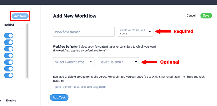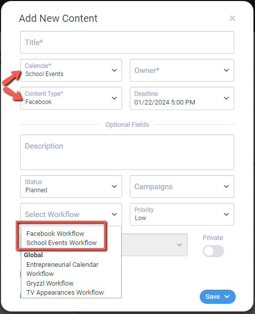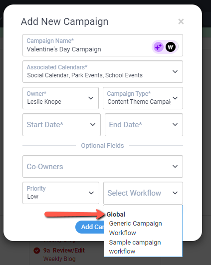 There is technically a third type of workflow that we call Global Workflows, but global workflows can be either a content or campaign workflow. The key distinction here is that global workflows are not specifically associated to content types, calendars, or campaign types. They're essentially orphan workflows that can be created and tied to projects anytime, manually.