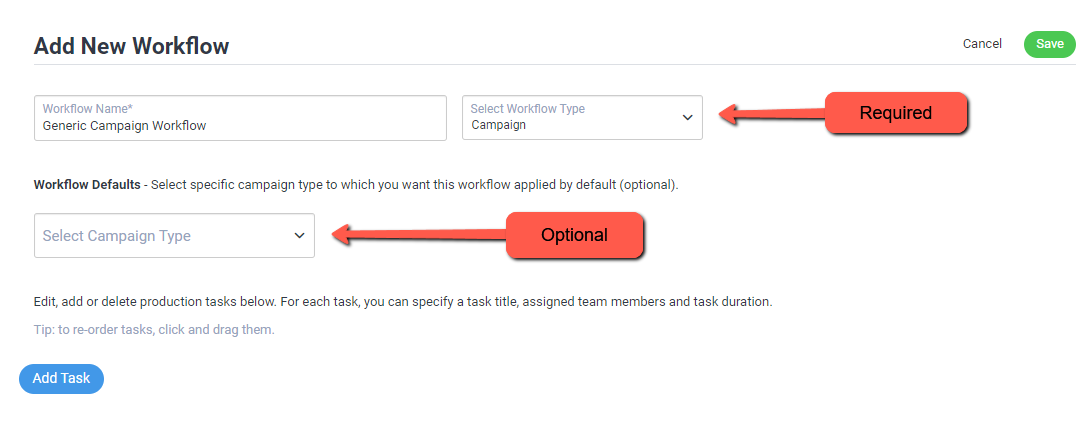 - Workflow Type - Are you building a content workflow or a campaign workflow? Select the appropriate option.