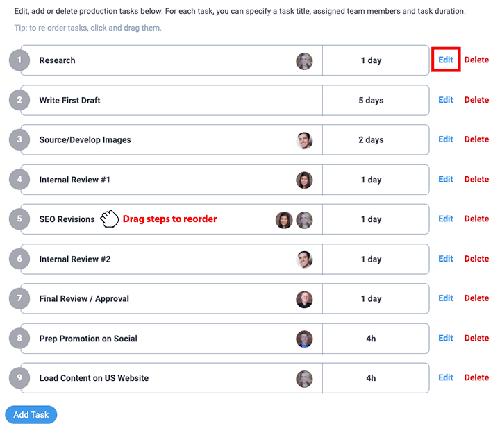 To edit an existing production step, simply click its corresponding edit button (screen below) to bring up its Add/Edit Task overlay. You can also grab and drag steps to reorder if needed.