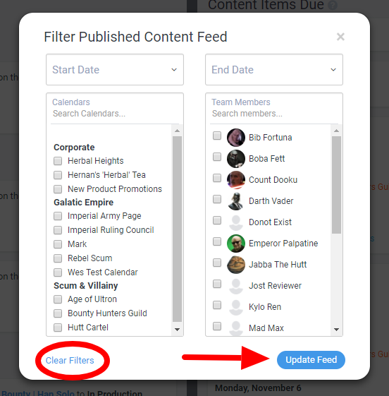 Once you've selected your desired dates, calendars or team members, click the blue Update Feed button to view your filtered feed of published content items. DivvyHQ will remember these filter settings until you change them.