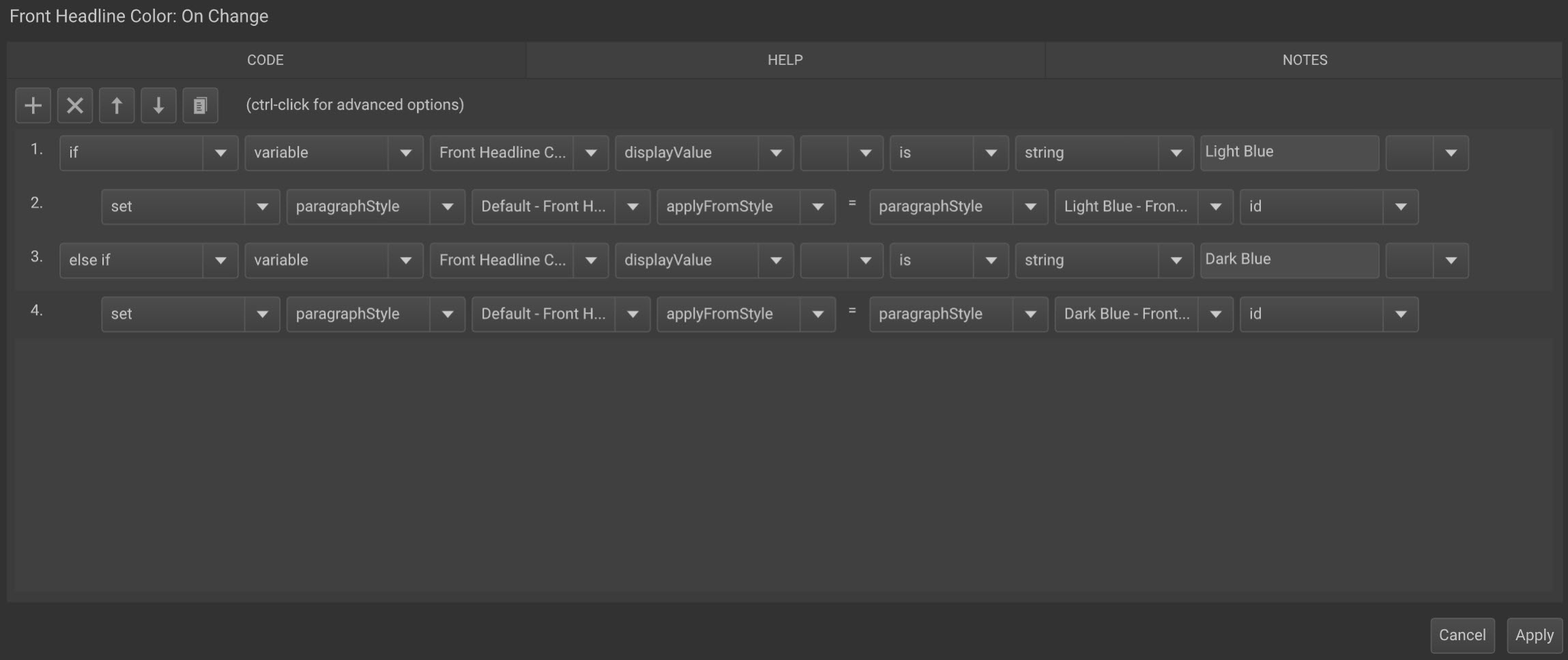- This line of code is telling CHILI what you want changed. It’s saying if your end user selects the paragraph style from step one, you want it to push that paragraph style to the default style.