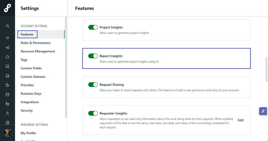 Under Features, toggle on Report Insights to enable the feature in your account.