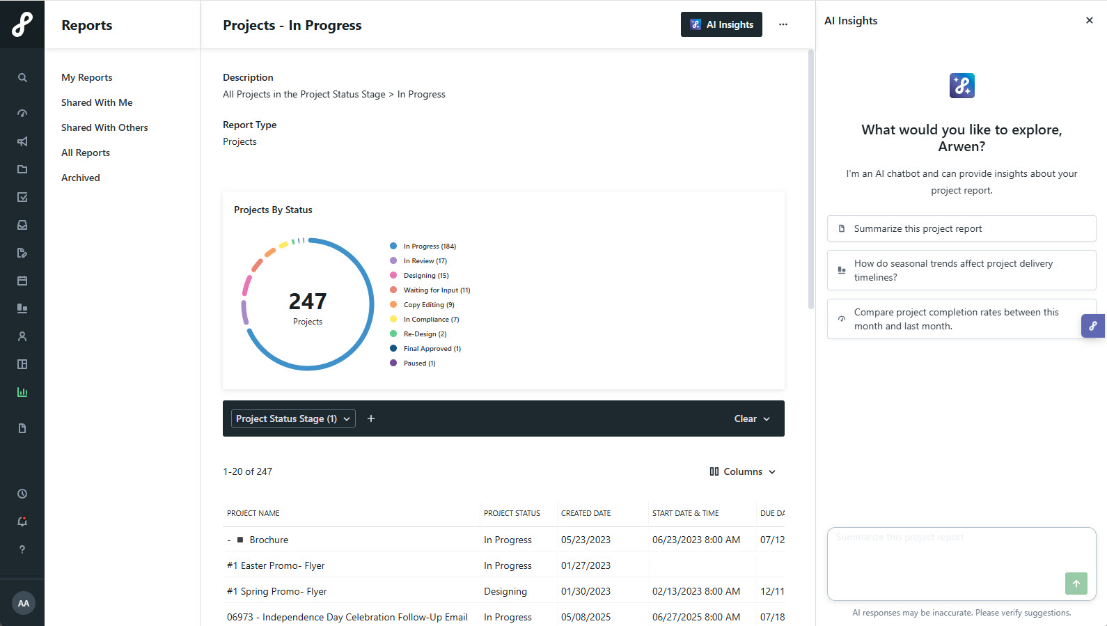 AI Report Insights helps you analyze report data by identifying trends, summarizing insights, and generating charts. Prompts will vary depending on the Report Type (Campaigns or Projects), but the examples below can help guide your analysis.