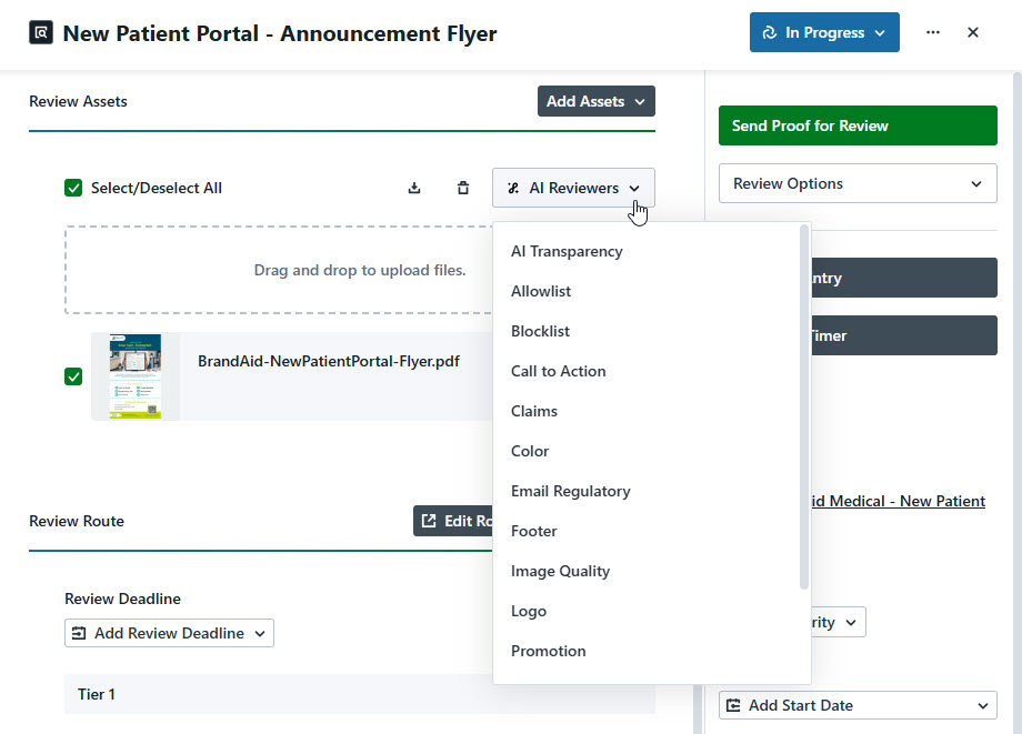 Select the AI Reviewer dropdown to choose the AI Reviewer(s) you want applied to each asset during Review. Available AI Reviewers depend on the asset type, so not all AI Reviewer will appear for every asset. You can assign different AI Reviewers to different assets within the same Proof.