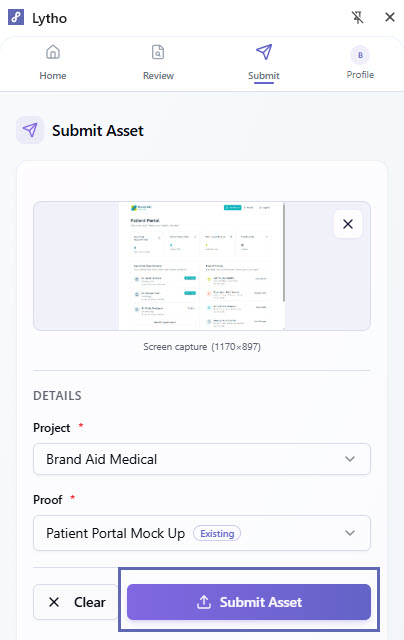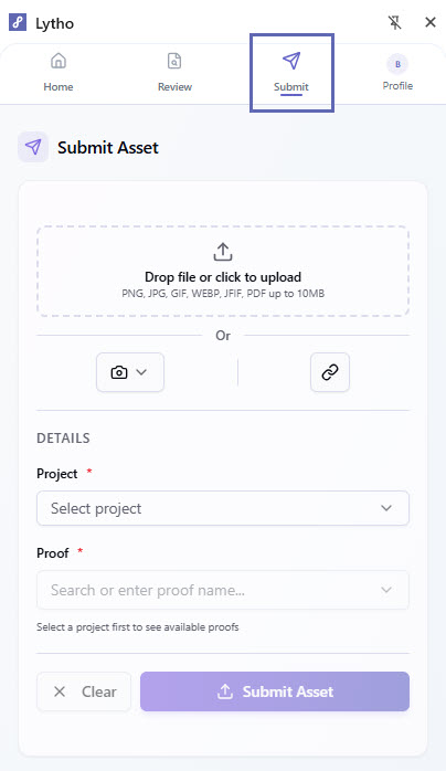 Submitting an asset does not send the Proof for review. This action only adds the asset to the proof. To route and send the Proof for approval, open the associated Proof in Lytho and follow your review workflow.Uploading Content to the Lytho Chrome Extension