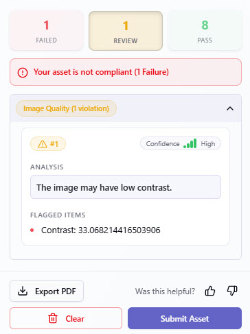 - Pass: The content meets the selected compliance criteria and no issues were detected.