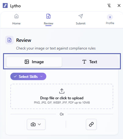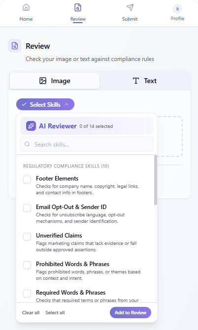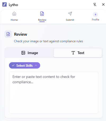 Once your content is added, select the type of compliance check you’d like to run using the Reviewer dropdown. These options are based on the AI Reviewers configured in Lytho.