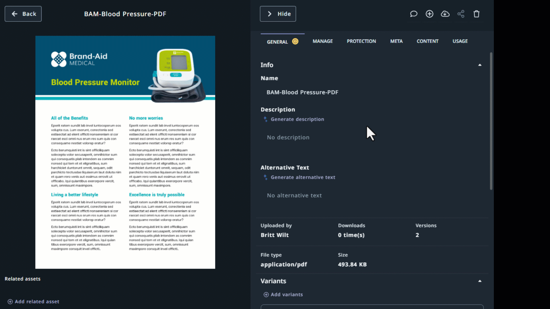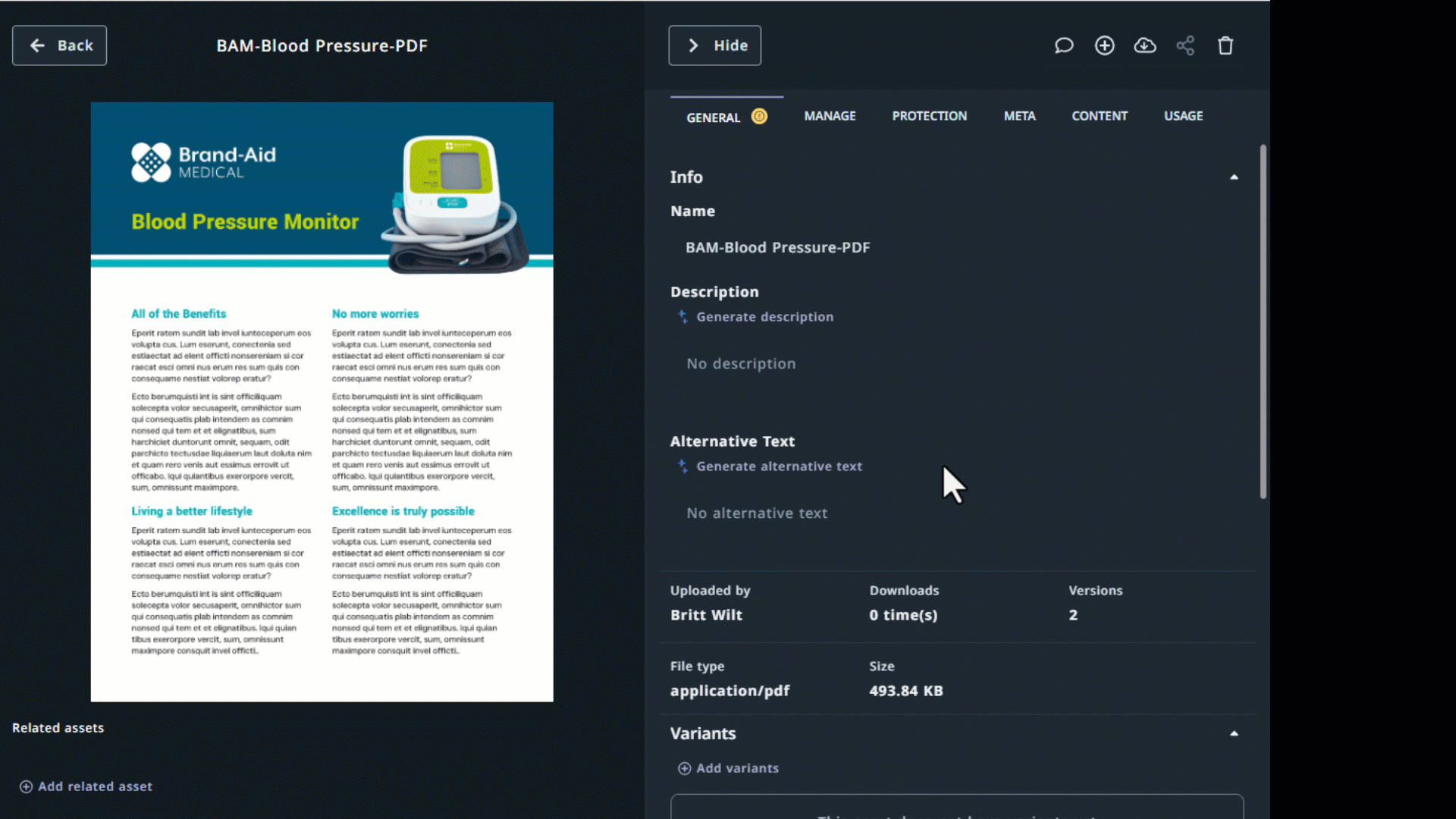 AI Description Generation enriches your assets with detailed, contextual descriptions, making it easier for teams to understand and reuse content. By automatically generating metadata, this feature improves asset clarity, supports governance, and reduces the burden of manual documentation.