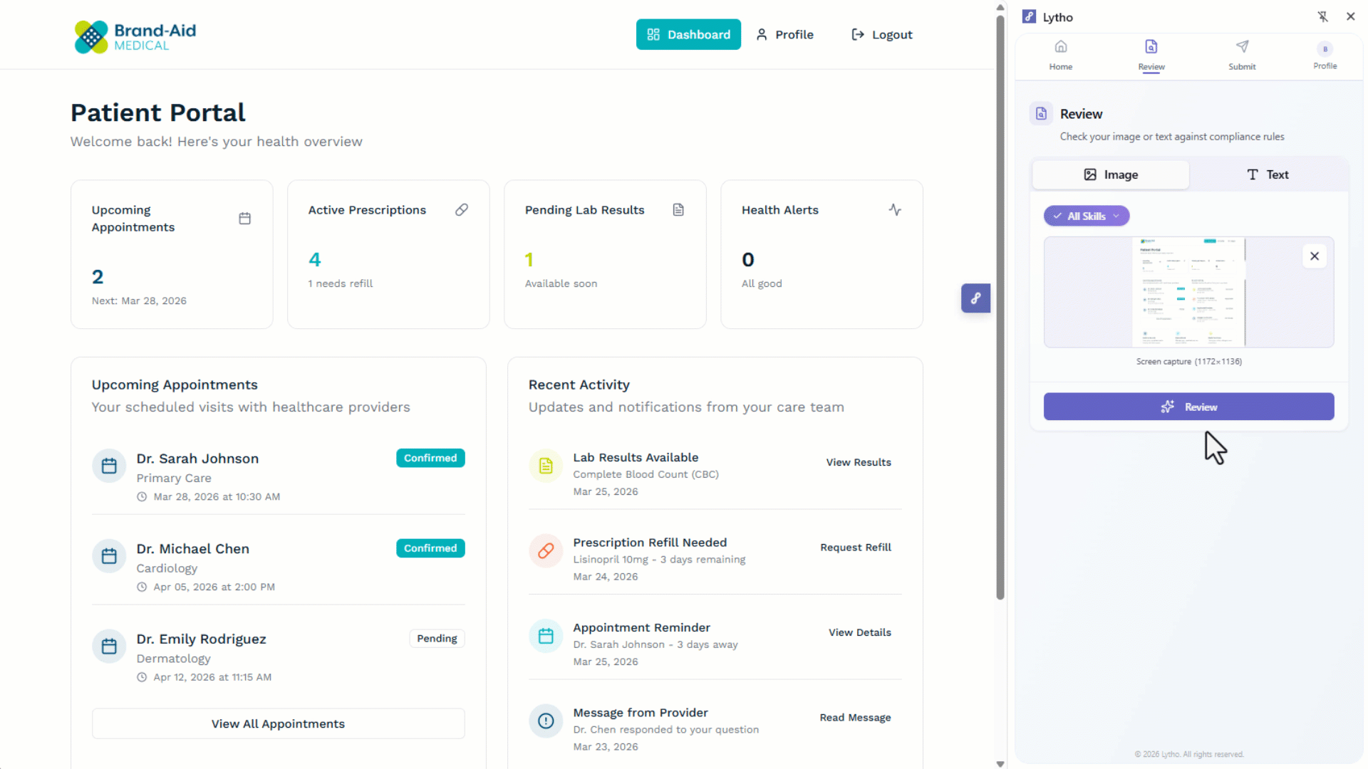 The Lytho Chrome Extension brings real-time compliance checking into the tools your team already uses, including Google Slides, CMS platforms, and social tools. Users can capture content directly from their browser, run AI-powered checks, and receive immediate feedback based on compliance findings. This enables teams across the organization to validate content before it goes live, reducing rework and ensuring brand consistency at the point of creation.